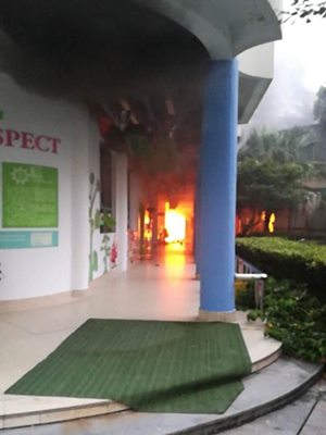 經(jīng)消防隊(duì)員20來(lái)分鐘的緊張撲救,火勢(shì)得到了控制。記者從現(xiàn)場(chǎng)向消防隊(duì)員了解到,起火點(diǎn)位于教學(xué)樓一樓的雜物間,里面都是桌椅板凳,因?yàn)樽酪紊嫌邢鹉z等材料,所以起火后煙量很大,由于滅火及時(shí),火情只蔓延到二樓。在火場(chǎng),沒(méi)有發(fā)現(xiàn)被困人員。