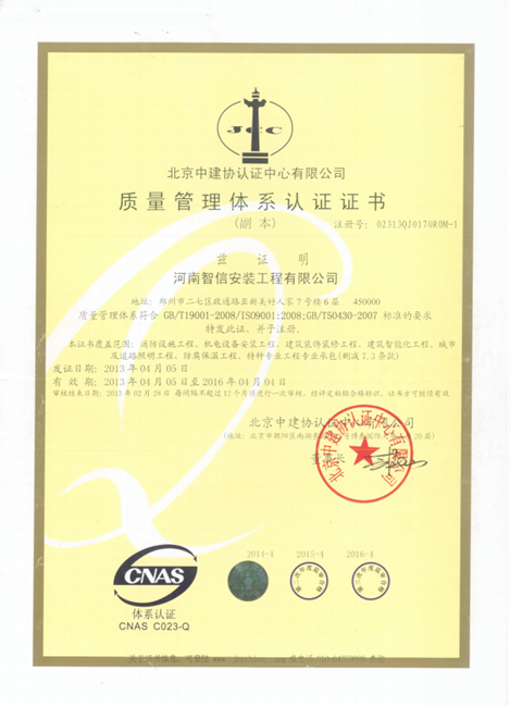 - 中億安(武漢)有限公司旗下的子公司智信安裝公司獲得"ISO9001國際質(zhì)量管理體系的認(rèn)證"