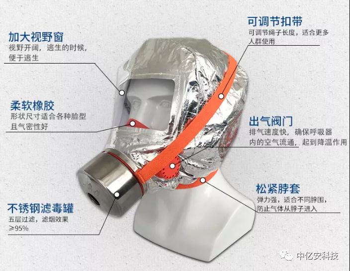 火災(zāi)逃生面具(規(guī)范名稱是消防過濾式自救呼吸器,又名防煙防毒面具,消防逃生面具)是一種保護(hù)人體呼吸器官不受外界有毒氣體傷害的專用呼吸裝置,它利用濾毒罐內(nèi)的藥劑、濾煙元件,將火場空氣中的有毒成份過濾掉,使之變?yōu)檩^為清潔的空氣,供逃生者呼吸用。